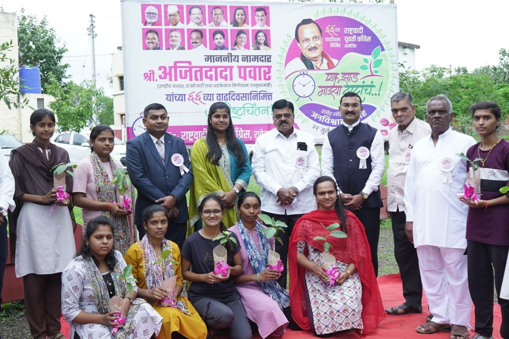 ‘एक झाड माझ्या दादांचं…!’ या उपक्रमांतर्गत राष्ट्रवादी युवती काँग्रेसने उपमुख्यमंत्री अजितदादा पवार यांच्या वाढदिवसाचे औचित्य साधून दहा विद्यार्थिनींना वटवृक्षाचे रोप भेट देत त्यांच्याकडून जगविण्याचे वचन घेतले. यावेळी संस्थेच्या आवारात अध्यक्ष श्री. संजयदादा गरुड यांच्याहस्ते वटवृक्ष लावण्यात आले तृप्ती बारी,रोहिणी गुजर,नेहा न्हावी, वृषाली पाटील, गायत्री पाटील, कोमल म्हस्के, सानिया गुजर, निकिता पाटील, आरती पाटील आणि योगेश्वरी वाघ या दहा युवतींनी झाडांचे संगोपन करण्याचा संकल्प केला.