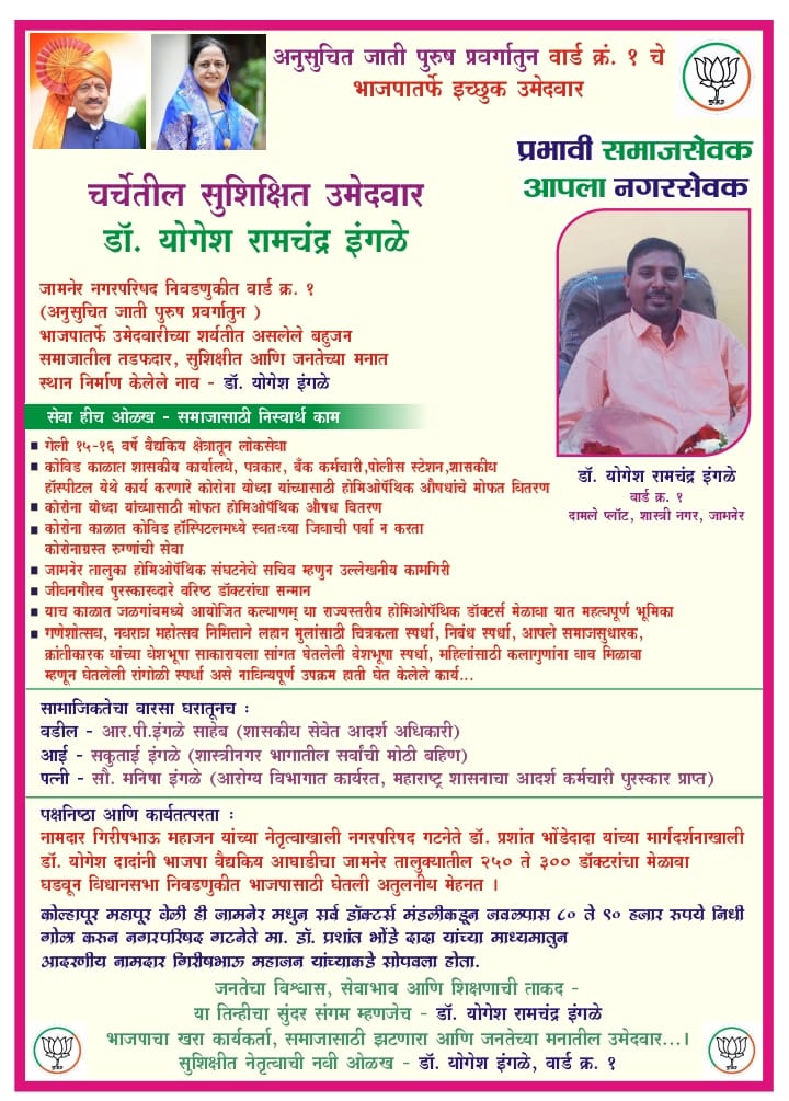 जामनेर नगरपरिषद निवडणुकीत गुरुवार, दि. 13 नोव्हेंबर 2025 रोजी सर्वांचे लक्ष वेधून घेत वार्ड क्रमांक 1 (अनुसूचित जाती प्रवर्ग) मधून भारतीय जनता पार्टीतर्फे पहिला उमेदवारी अर्ज दाखल झाला. डॉ. योगेश रामचंद्र इंगळे यांनी भाजपाच्या अधिकृत उमेदवार म्हणून आपला उमेदवारी अर्ज सादर करून निवडणूक रिंगणात दमदार प्रवेश केला.